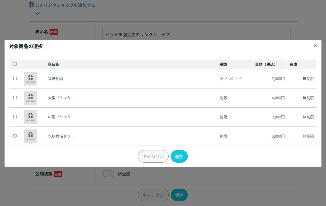 - 「商品を追加する」から作成済みの商品を選択し設定します。また商品は複数選択が可能です。